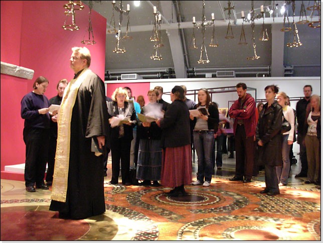 Isä Rauno toimitti näyttelyn "kirkkosalissa" moleben-rukouspalveluksen kuoron avustamana.